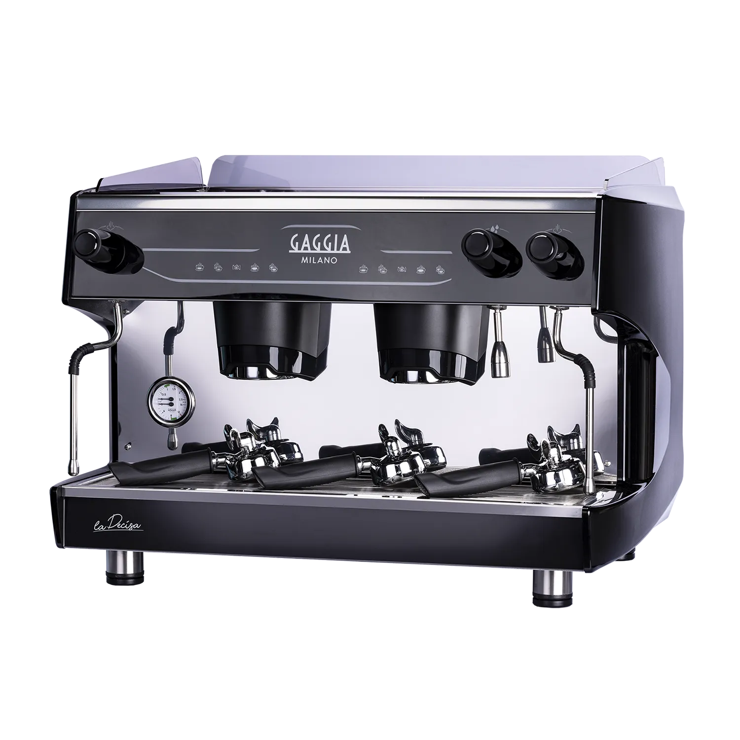 Die Gaggia La Decisa 2-Gruppen-Maschine verbindet traditionelle italienische Espresso-Kultur mit moderner Technik. Sie überzeugt durch hohe Ergonomie: eine beleuchtete Arbeitsfläche, hintergrundbeleuchtete Direktwahltasten und ein schrägstehender Siebträgergriff sorgen für komfortables Arbeiten.